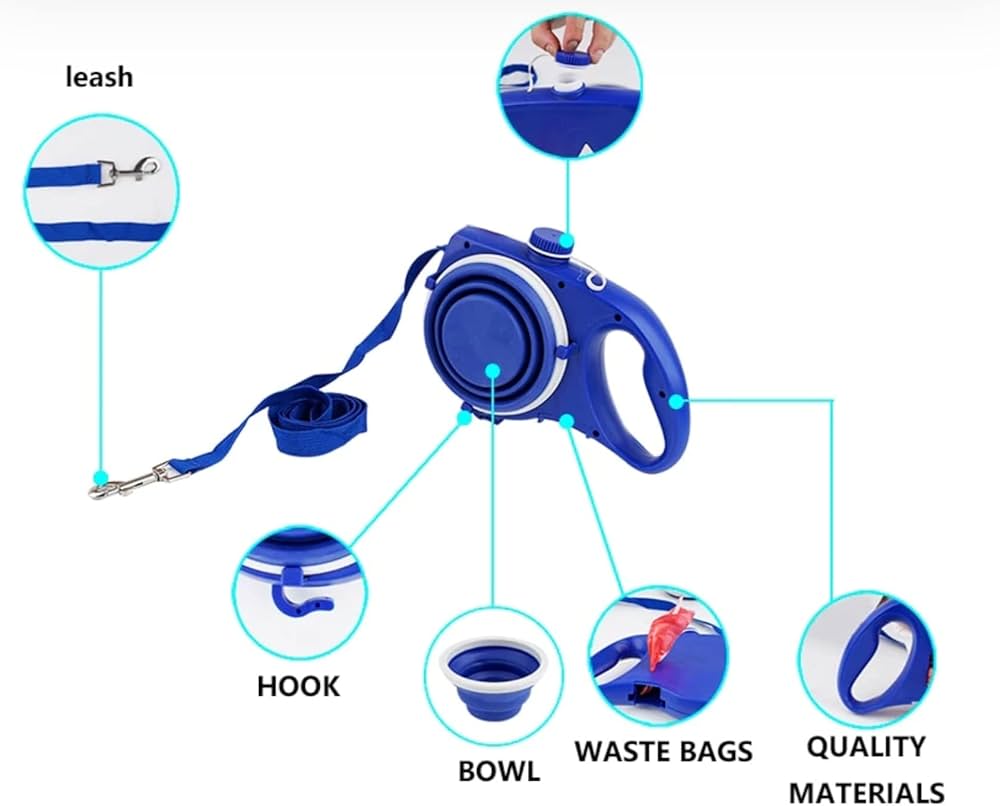 4-in-1 multifunctional dog leash with foldable water bowl, 300ml bottle, and waste bag holder, made of durable safe materials, perfect for large dogs and outdoor